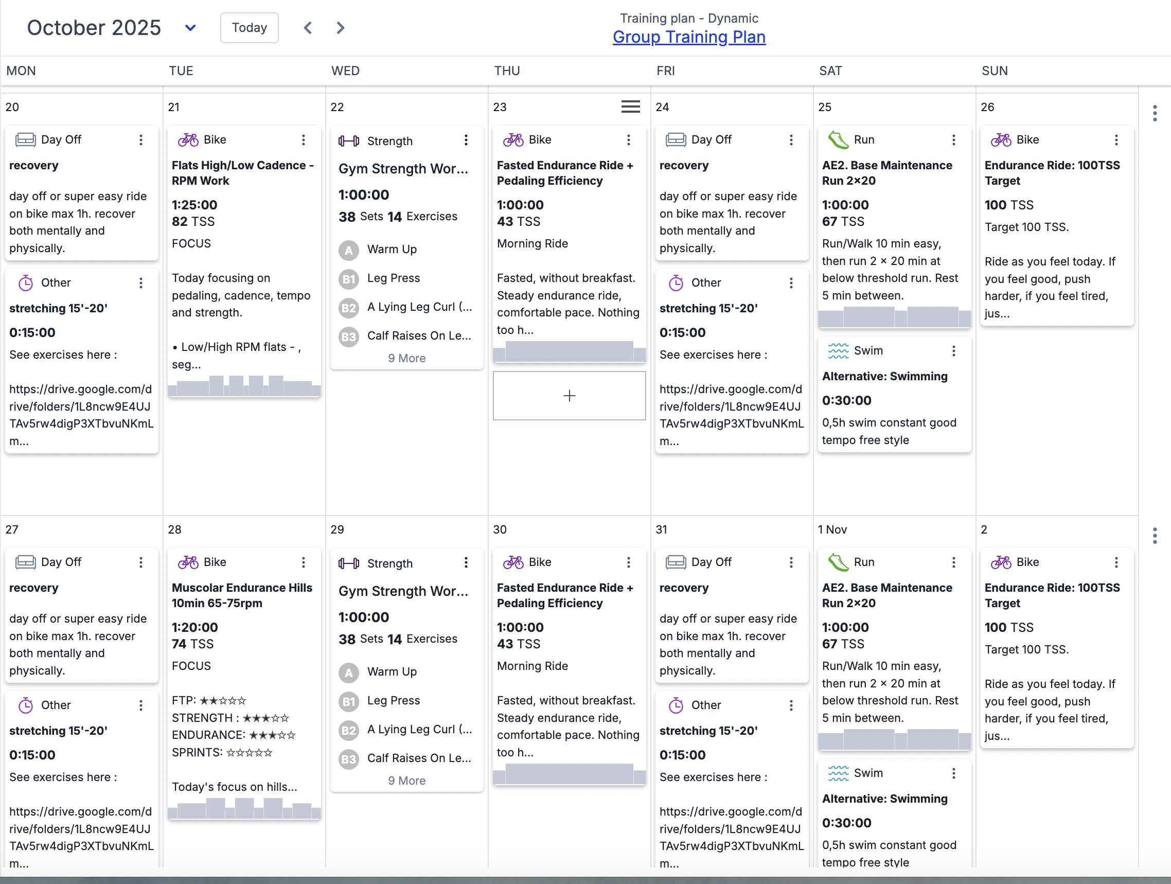 Training plan and workouts are uploaded to a live TrainingPeaks calendar. Any adjustment to the plan is applied to all athletes of this group.